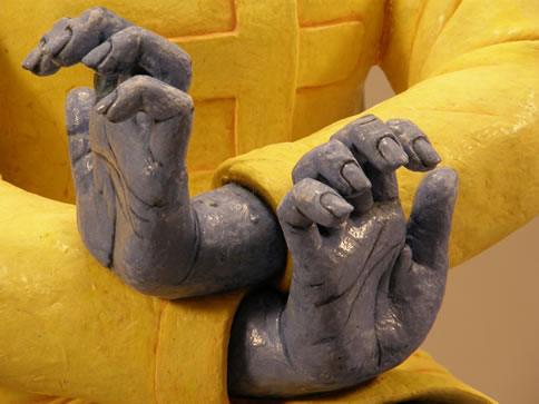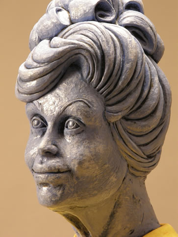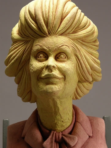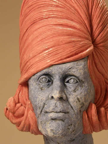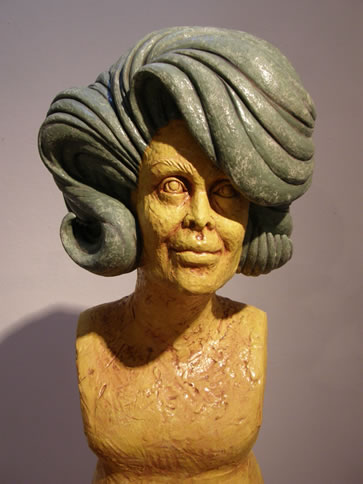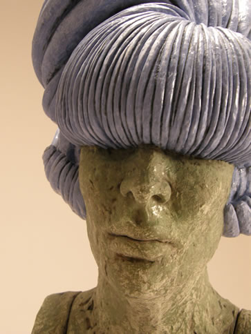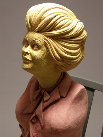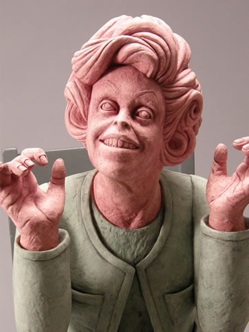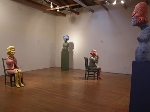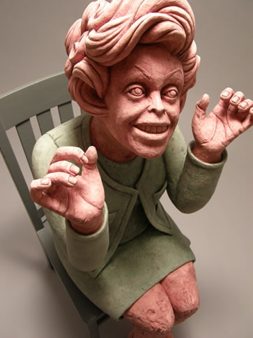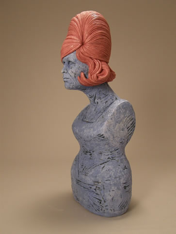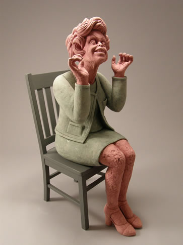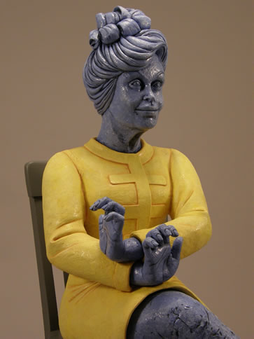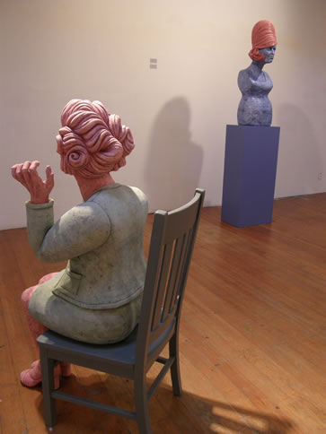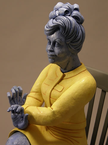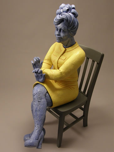 Issues surrounding femininity and set standards of normalcy, propriety and societal expectation inform my work. In this body of work, I challenge conventional standards of beauty, power, aging and class. The work is further influenced by vintage horror movies that deal with modern everyday insecurities and current films like Boxing Helena. The Chanel series is comprised of three life-size ceramic women seated in chairs. These pastel colored, cosmetically enhanced women sit and pose in Chanel suits with large, elaborate coiffures. These “ladies who lunch” live in a world where the line between youth and old age is blurred.