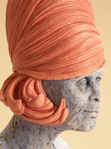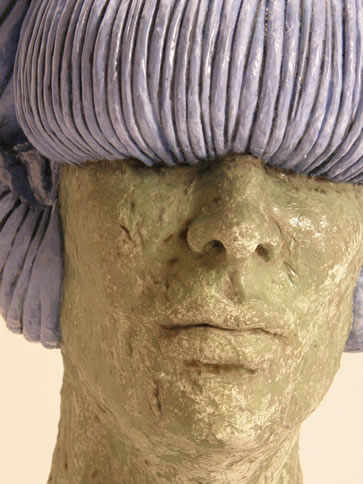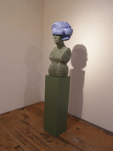 From the Chanel series, Big Hair emerged. Big Hair is comprised of three armless, legless sculptures in the form of mannequin bodies or dress forms that hold up heads with enormous vintage hairstyles. Casting aside the traditional terms, “bust” or “torso”, these sculptures are referred to as “stumps”. Their gaze is unapologetic, even through hair that hides the ability to see. These limbless forms have detachable heads that reference the santos doll or “saint” figures from the Spanish speaking Americas. In both series, a uniform color palette (a signifier for the colors of Chanel) is used as a formal device on the textural surface of the figure and the modeled surface of the clothing and hair.