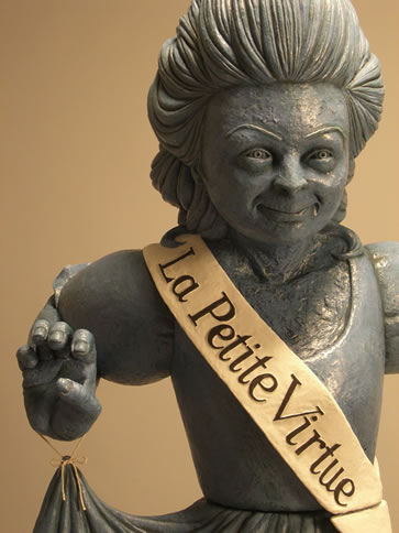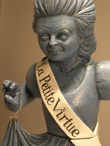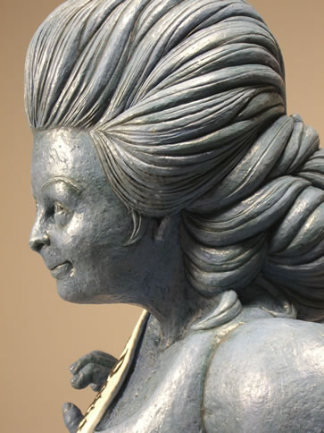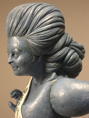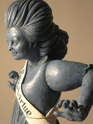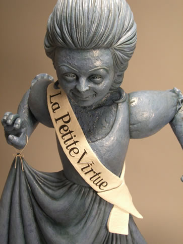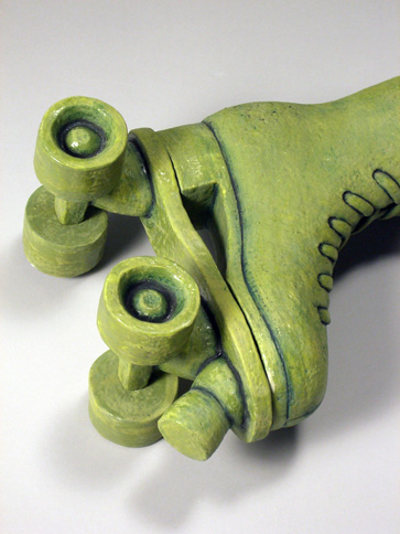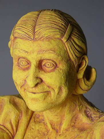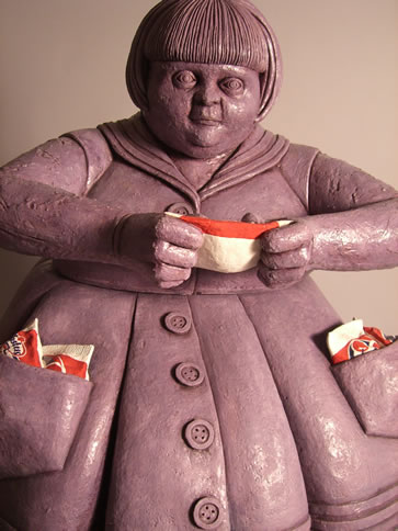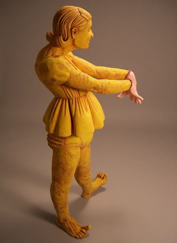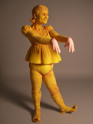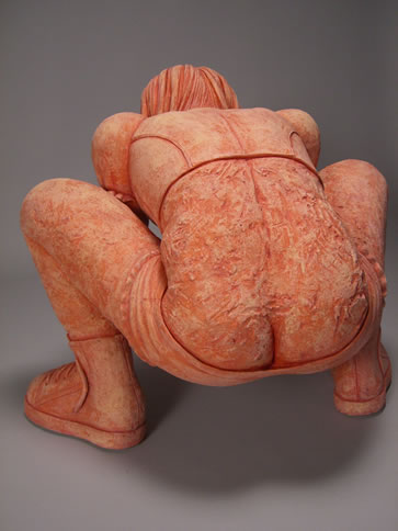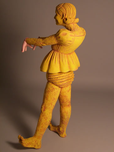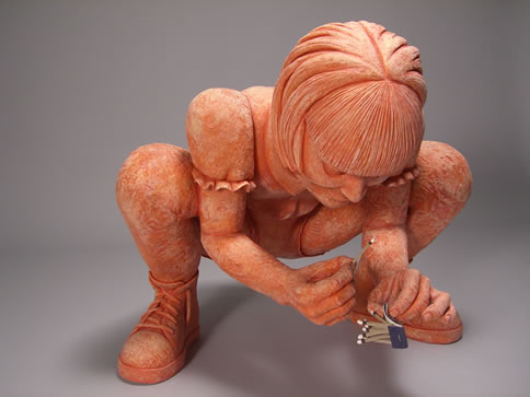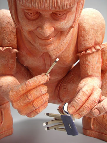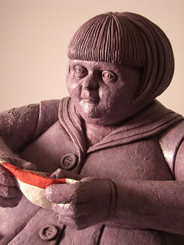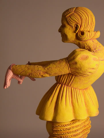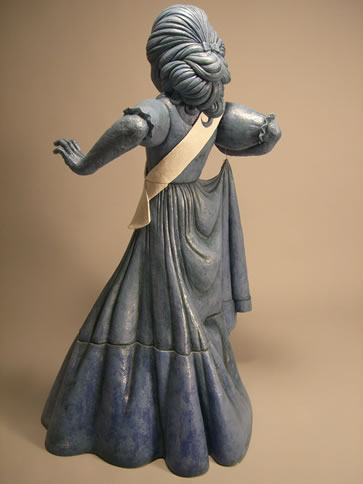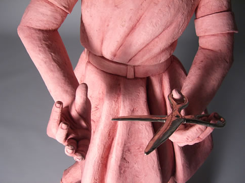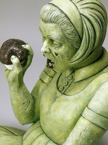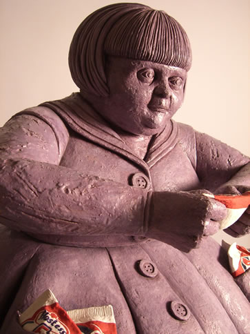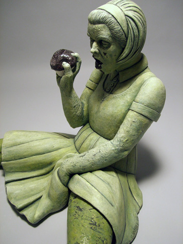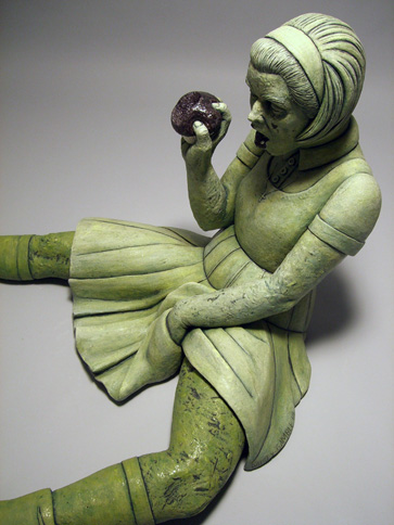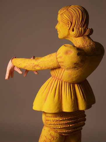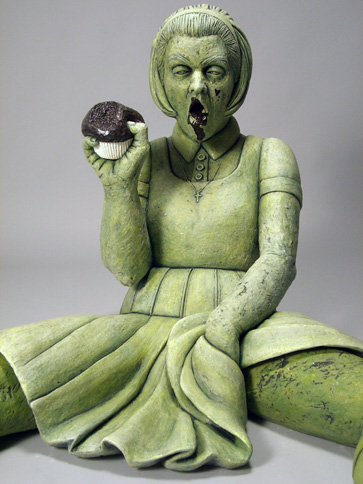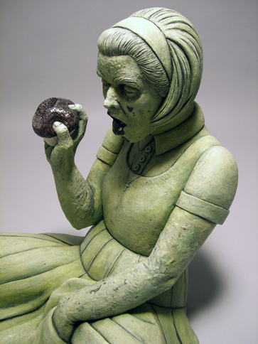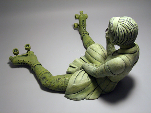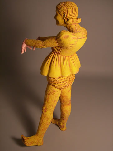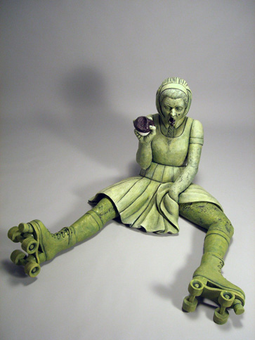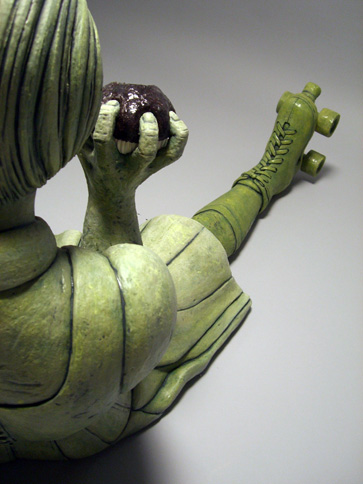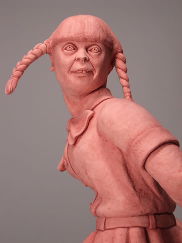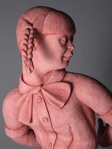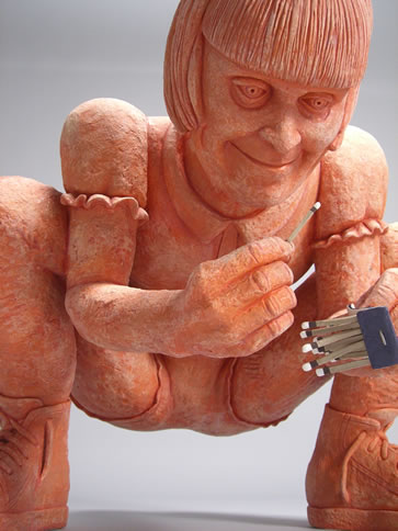 Focusing on the eccentric and unique qualities of the human figure, my ceramic work is derived from a combination of fantasy and reality. Gesture, posture and exaggeration of features play an important role in my ability to create dynamic sculptures that capture a moment in time. These snapshot sculptures in the series, Sweet Terror, display my interest in performance and an early background in puppetry. The work is further influenced by childhood memories and the id. I am interested in questioning the perception of normalcy, morality, and appropriateness, while examining human social behavior. In my present ceramic work, I employ the imagery of children. These life size children are influenced by the study of sociopaths and horror films that deal with modern everyday insecurities. They live in a world where the line between adulthood and childhood is blurred. At once hideous and beautiful, sweet and terrifying, these free-willed children challenge our notion of innocence when they are presented with a chance to sin. With a lack of self-awareness or understanding of social norms, the child’s body expresses exaggerated emotional states. The work is displayed off of the traditional pedestal and meant for in-the-round viewing as an object existing in the same type of space as the viewer's. I use monochrome color on the textural surface of the figure as a formal device to recollect childhood nostalgia.